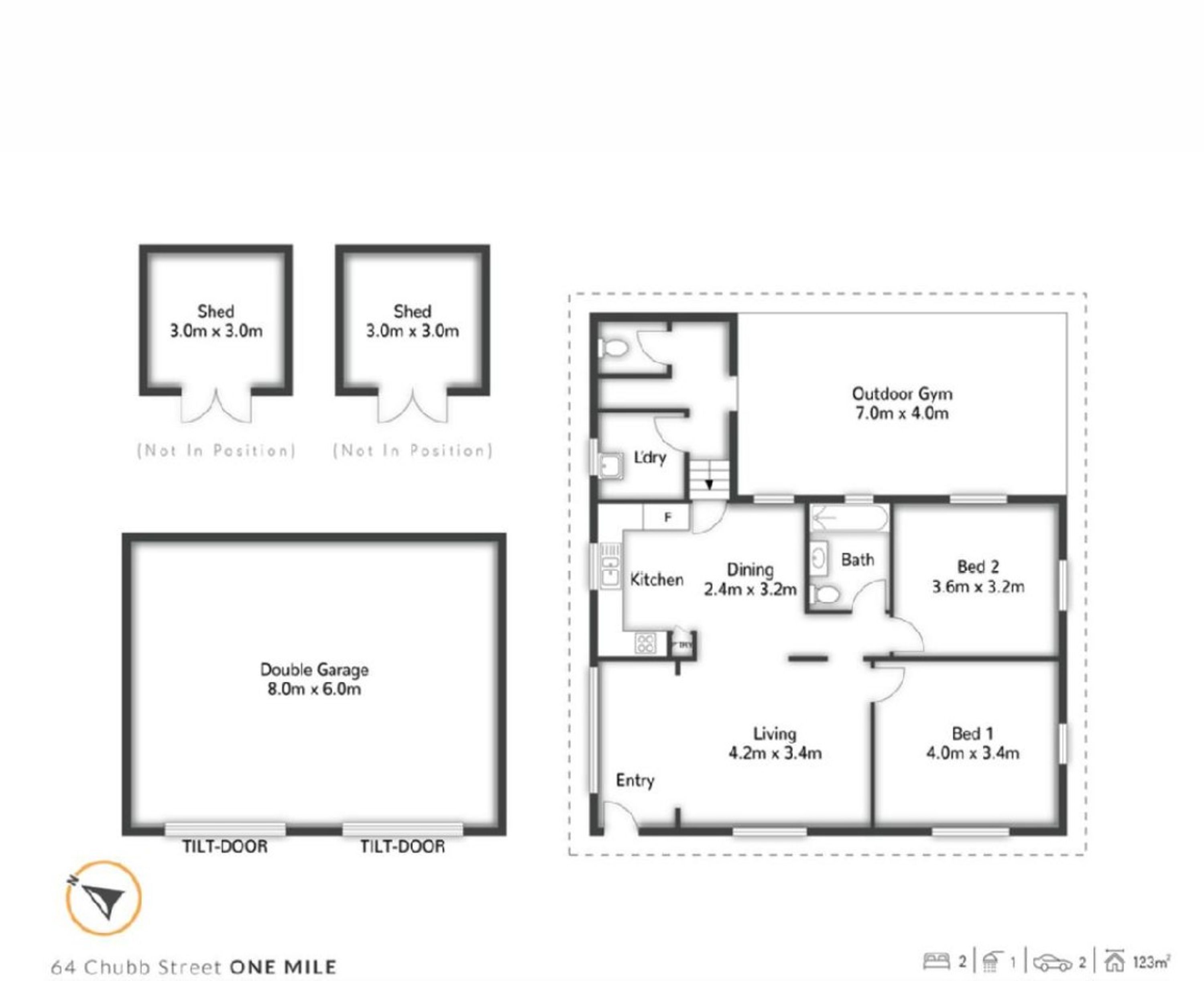 - Two good-sized bedrooms + 4 garages or workshops